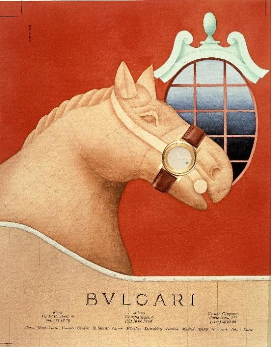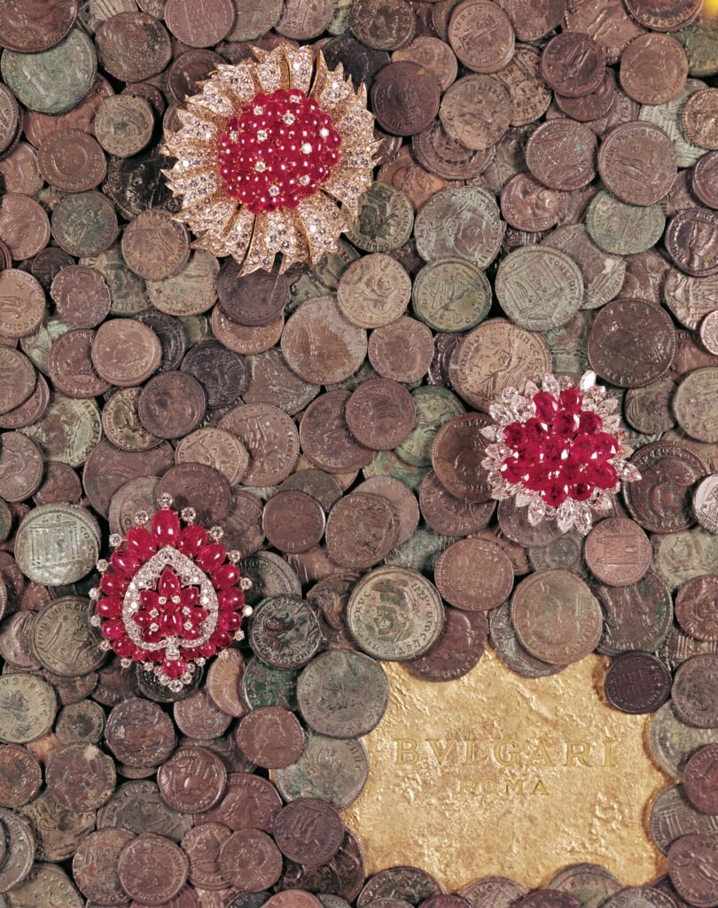 Spille preziosissime sono ritratte in un campo di palline da ping-pong o su tappeti di antiche monete, gli orologi (uno su tutti, il Bvlgari Bvlgari che emerge come icona indiscussa) sono utilizzati come finimenti per eleganti destrieri. Linee audaci, combinazioni cromatiche inaspettate e un uso pionieristico delle gemme policrome sono gli elementi qui raccontati, diventati cifre stilistiche iconiche della Maison.