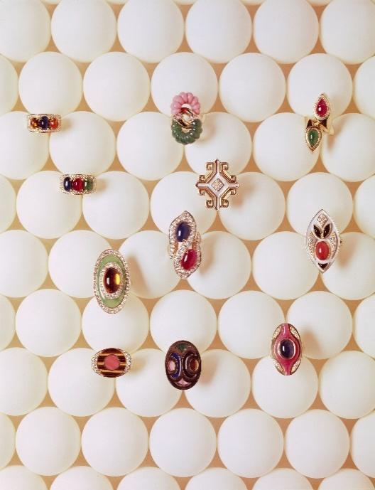 A sinistra, la campagna pubblicitaria ritrae spille e anelli in oro con pietre preziose colorate, ca. 1970 – Egg backgound, 1970-1975, Gaio Bacci, Archivi Storici Bvlgari.
