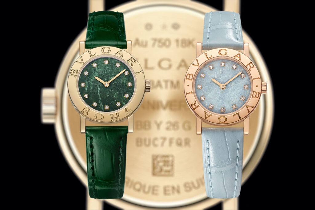 Questi modelli Bvlgari Bvlgari sono abbinati a cinturini in alligatore tono su tono e fibbia coordinata in oro giallo o rosa. Le versioni automatiche, con cassa da 38 millimetri e quadrante verde o blu, hanno un prezzo di 18.000 euro ciascuna, mentre i modelli più piccoli al quarzo sono proposti a 13.500 euro.