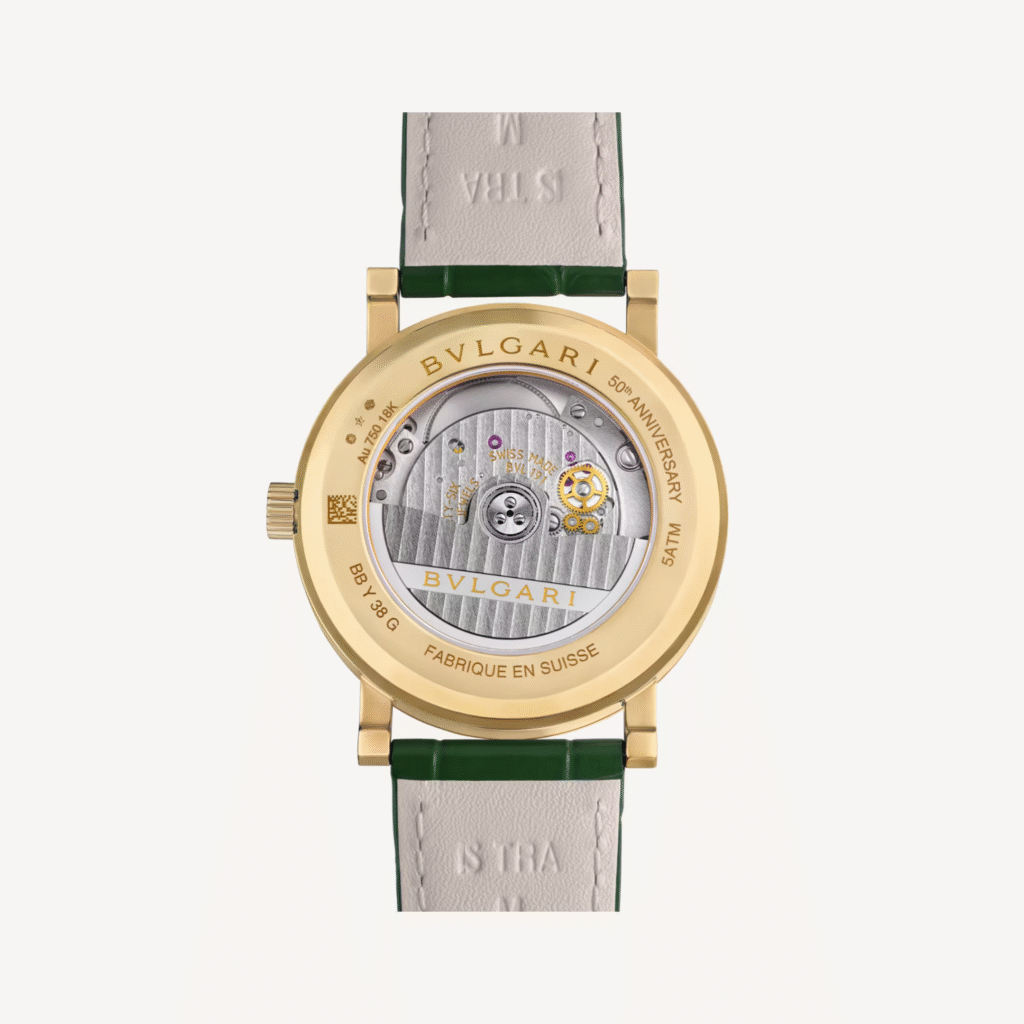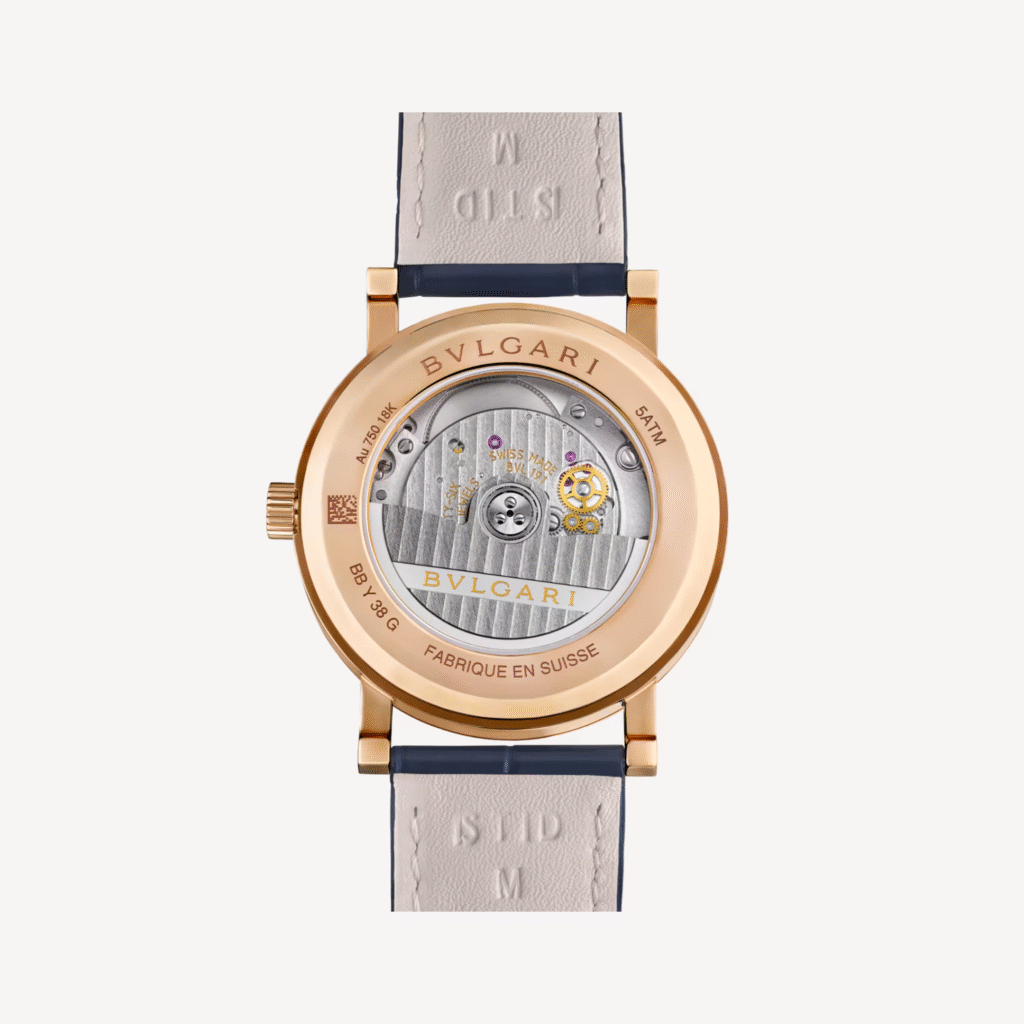 La casa madre lo definisce un movimento di “complessa semplicità”, ed è proprio da qui che deriva il nome Solotempo, espressione che sottolinea la purezza di un calibro dedicato esclusivamente a ore, minuti, secondi e data (funzione che in questi modelli non è utilizzata). Visibile attraverso il fondello in vetro zaffiro, il movimento automatico è decorato con Côtes de Genève e arricchito dal logo Bvlgari dorato sul rotore.