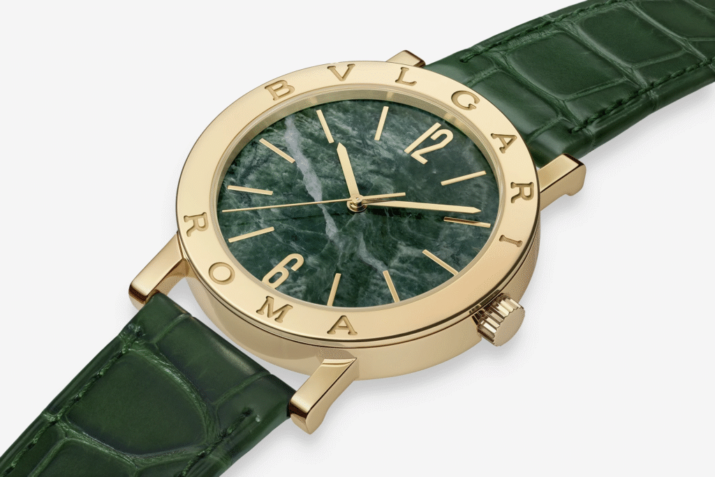 Simbolo per eccellenza dello splendore e della ricchezza della Roma antica, il marmo rappresenta per Bvlgari non solo un materiale di enorme complessità materica e varietà cromatica, ma un’autentica espressione artistica, un manifesto tangibile ed esibito del legame profondo con il mondo dell’Antichità Classica. Per questi modelli, Bulgari sceglie il marmo verde Verde Alpi abbinato all’oro giallo, e per le versioni in oro rosa i marmi blu profondo Blu Incanto e azzurro ghiaccio Azzurro infinito.