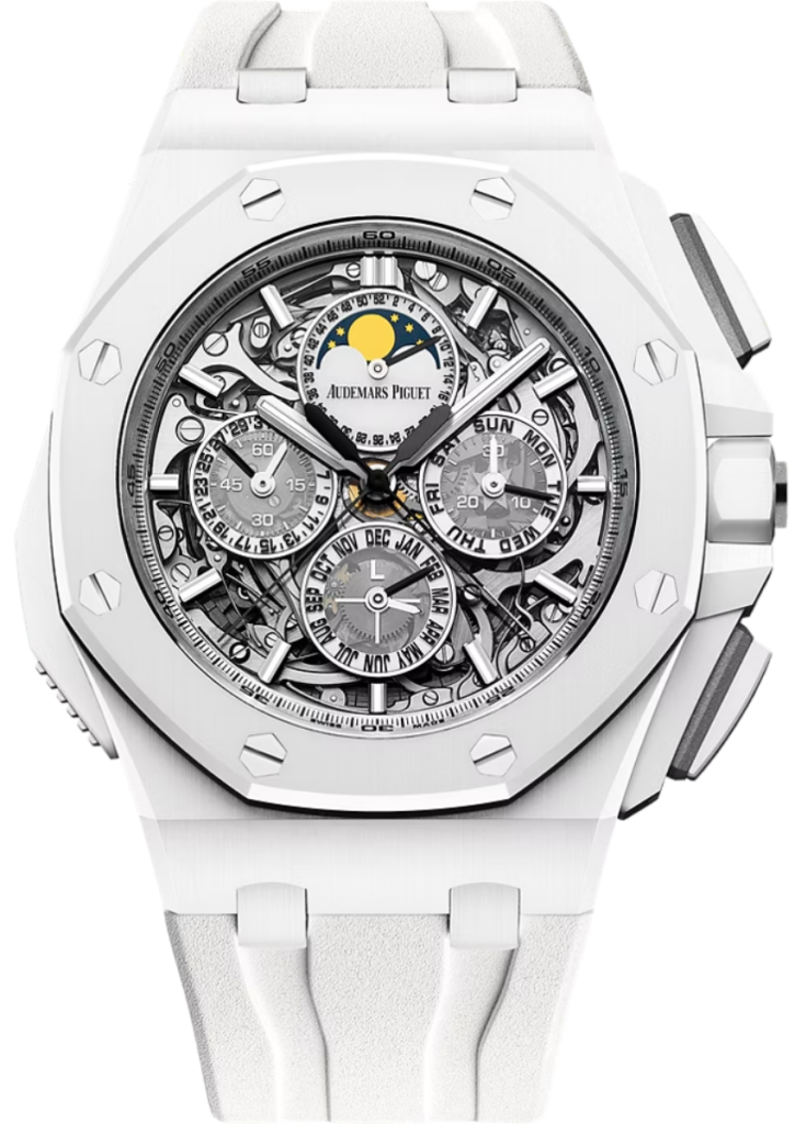 A mio avviso, gli esperimenti più riusciti sono senz’altro rappresentati dalle Grandi Complicazioni, prodotte in pochissimi esemplari nel corso degli anni e spesso arricchite dall’impiego di materiali inusuali, come la ceramica. Le configurazioni sono state molto diverse nel tempo, ma se ci soffermiamo su quella attualmente in catalogo – la Ref. 26582CB.OO.A010CA.01 – notiamo quanto siano incredibili questi segnatempo.