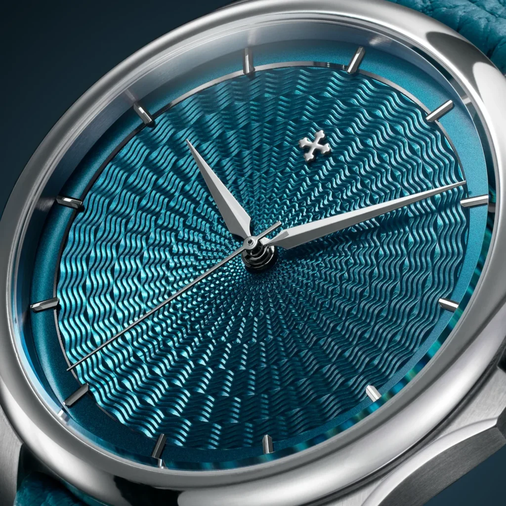 Il primo elemento che cattura lo sguardo è il quadrante azzurro, inciso a mano con tecnica guilloché. La trama radiale nasce dalla sensibilità e dalla precisione dell’artigiano, mentre il trattamento IP dona profondità e dinamismo ai riflessi metallici, creando un effetto visivo magnetico.