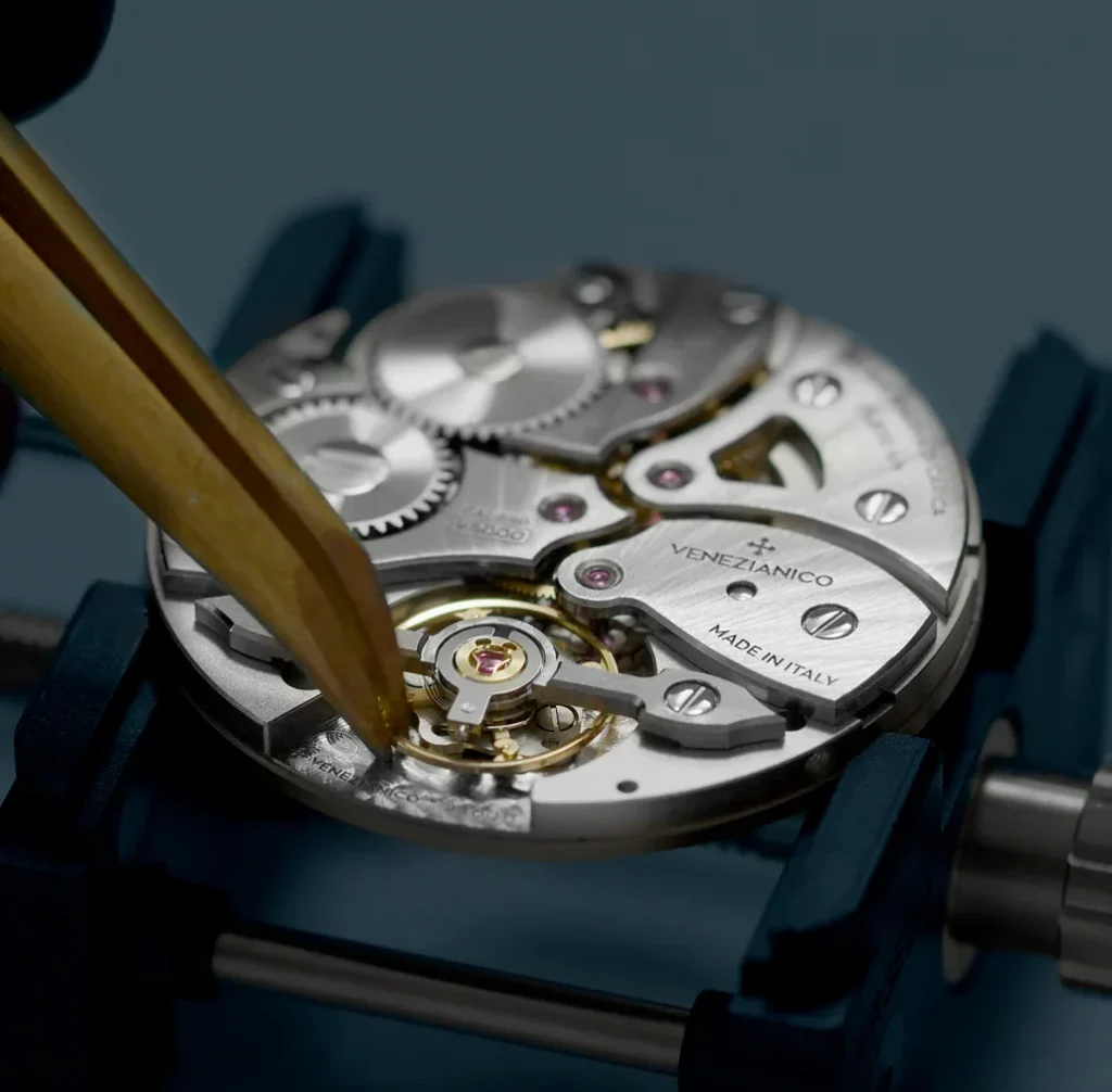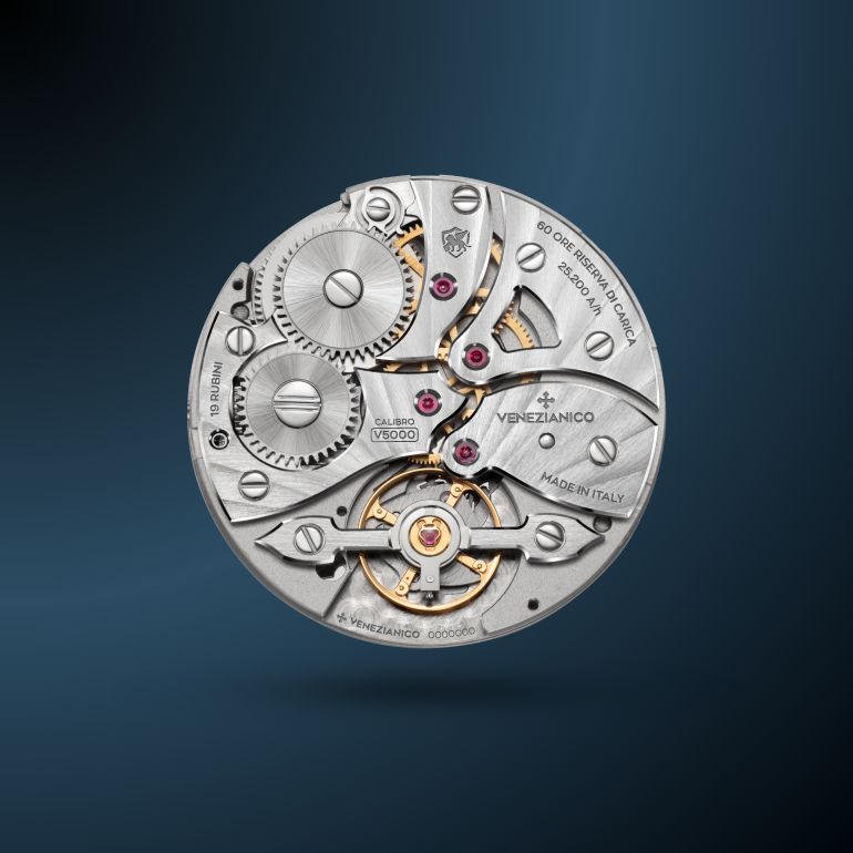 Il cuore pulsante del Redentore Utopia è il calibro V5000, il primo movimento di manifattura interamente progettato da Venezianico. Il progetto è stato sviluppato sotto la direzione tecnica di Andrea Menegazzo e grazie alla visione industriale di Fausto Berizzi, con la volontà dei fratelli Alberto e Alessandro Morelli, fondatori del brand.