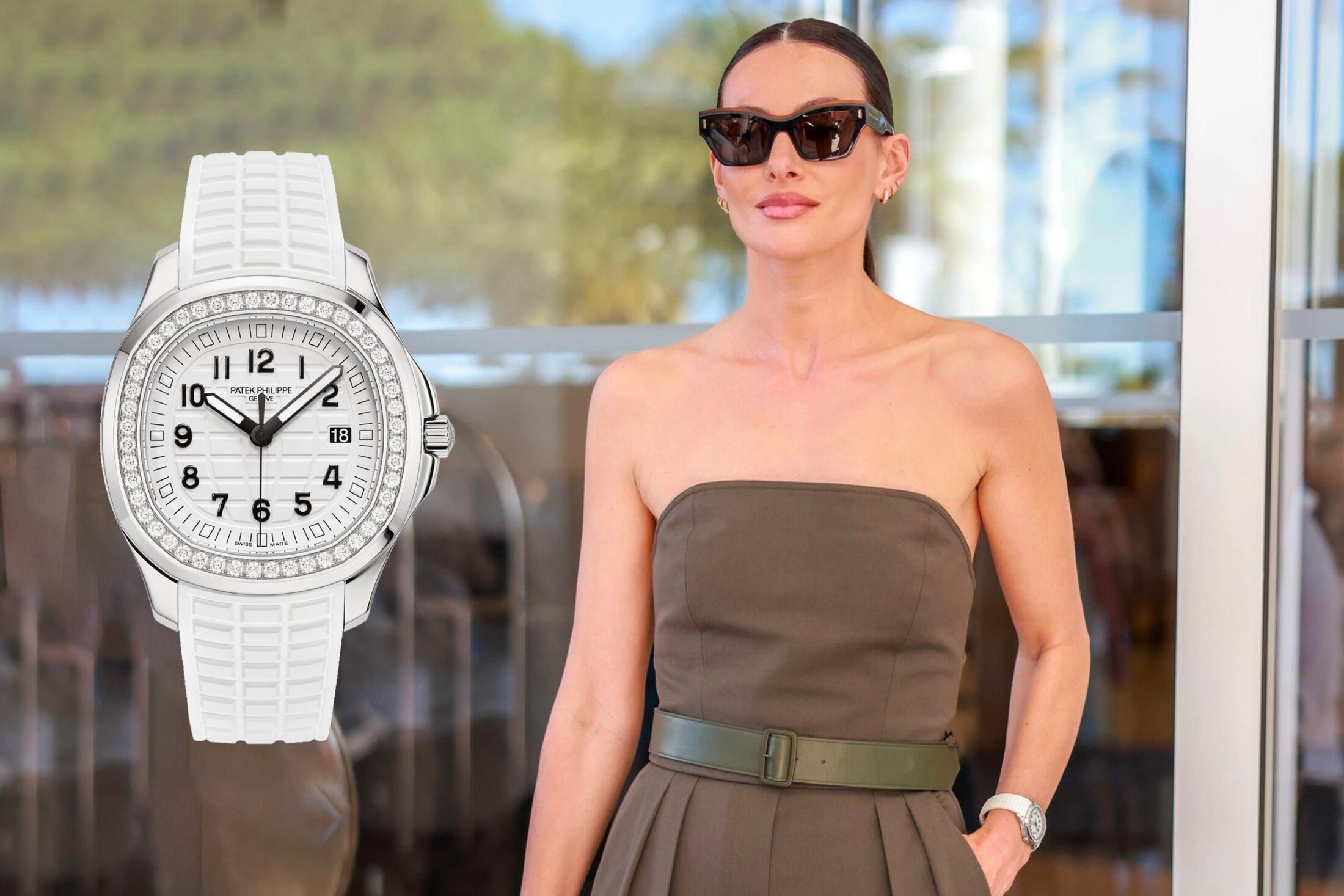 Italian influencer and model Paola Turani conquered the Cannes red carpet with her grace and style. On her wrist we find a sporty yet refined Patek Aquanaut Lady white 5267/200A. It features a stainless steel case and a diamond-set bezel. The white strap and dial add a touch of summer freshness. This watch testifies to Patek Philippe’s mastery of combining sophistication and sportiness. Although we definitely prefer other models from the Geneva manufacture.