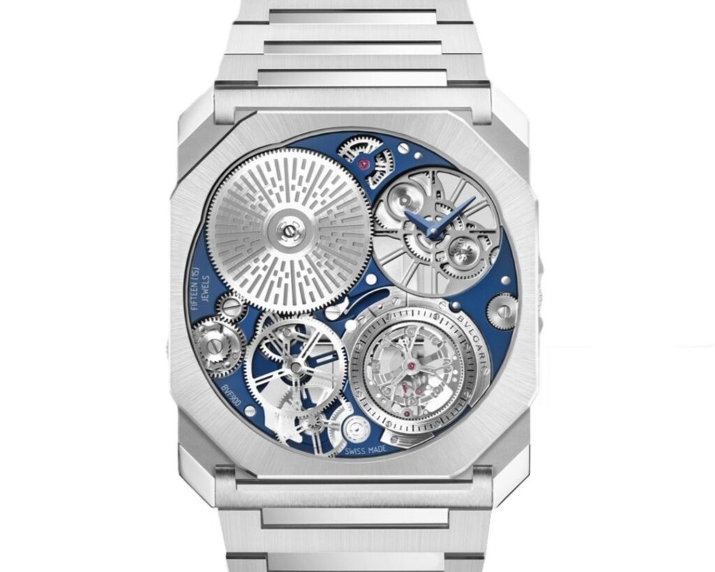 Octo Finissimo Ultra Tourbillon Platinum, da 40 mm, in platino satinato e lucido, spessore di 1,85 mm, platina e fondello in carburo di tungsteno, tamburo del bariletto satinato circolare e inciso radialmente e corone planari in acciaio sabbiato al 3 (messa all’ora) e all’8 (ricarica del meccanismo). Parti piene del quadrante in blu, quadrante piccolo scheletrato di ore e minuti in ottone opalino con lancette Dauphine azzurrate e indici squelette; scala dei secondi satinata circolare ad incorniciare la gabbia del tourbillon al 5. Calibro manuale di manifattura, BVF 900: platina in carburo di tungsteno, bilanciere a regolazione inerziale oscillante a 28.800 alternanze/ora, 15 rubini, riserva di carica di 42 ore. Bracciale in platino con fibbia pieghevole integrata dello spessore di 1,5 mm. Edizione limitata a 10 esemplari.