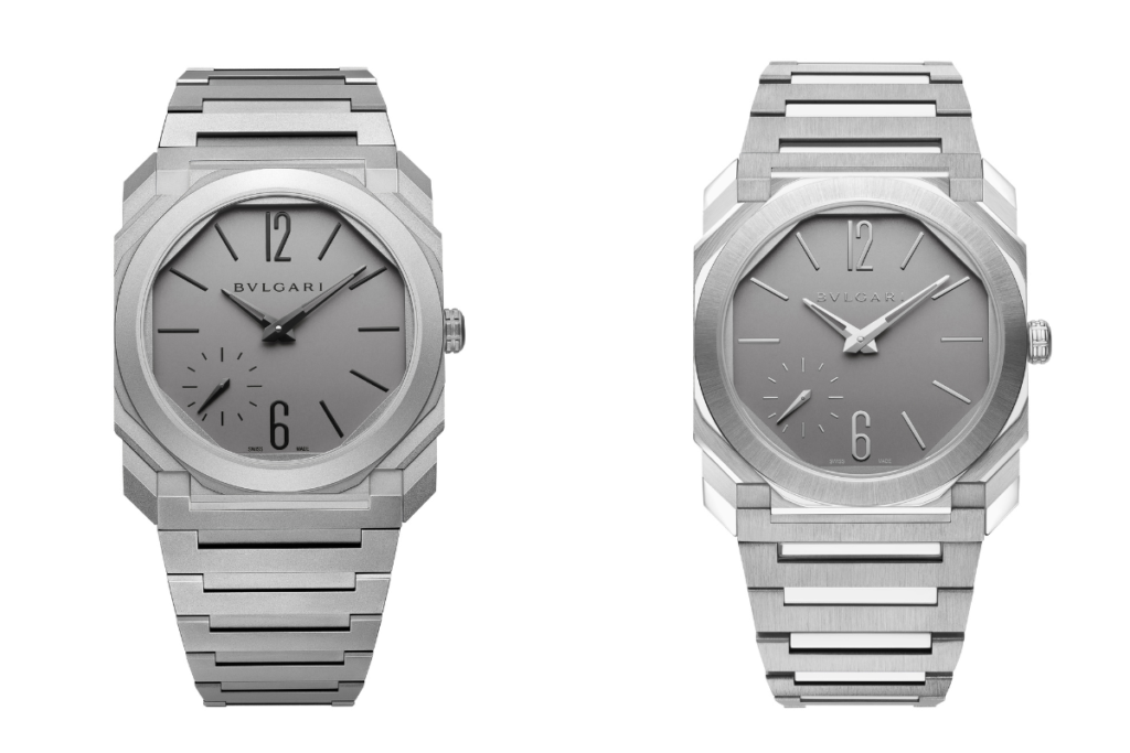 A sinistra, Octo Finissimo 37, in titanio sabbiato, da 37 mm. Quadrante in titanio opalino con lancette Dauphine e indici bruniti, piccoli secondi al 7/8. Bracciale in titanio sabbiato con fibbia déployante integrata da pulsanti. A destra, Octo Finissimo 37, in titanio satinato e lucido, da 37 mm. Quadrante in titanio opalino con lancette Dauphine e indici applicati rodiati. Bracciale in titanio satinato e lucido. In entrambi, batte il movimento automatico di manifattura, calibro BVF 100, riserva di carica di 72 ore.