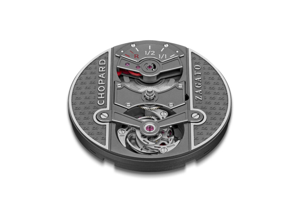 Nello Chopard Zagato Lab One Concept, il quadrante coincide con la platina del movimento. Il motivo “Z” di Zagato emerge in rilievo positivo, mentre loghi e smussi rodiati definiscono i volumi e guidano la lettura delle indicazioni. Le sfere scheletrate e il ponte del Tourbillon, ispirati ai volanti a razze, con la riserva di carica che ricorda l’indicatore del carburante rafforzano il legame con il mondo automobilistico senza compromettere la chiarezza visiva.