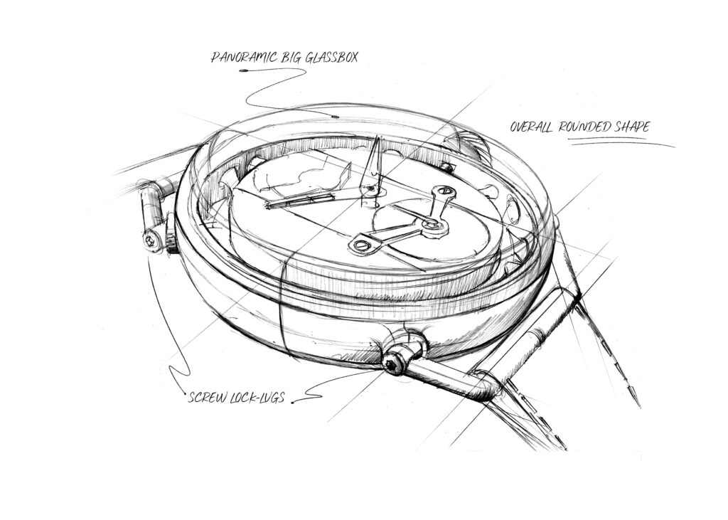 Il vetro zaffiro tipo box, a filo con la carrure, offre una visione continua dell’insieme. Lo stesso principio viene ripreso sul fondello, permettendo una lettura integrale dell’architettura del calibro.