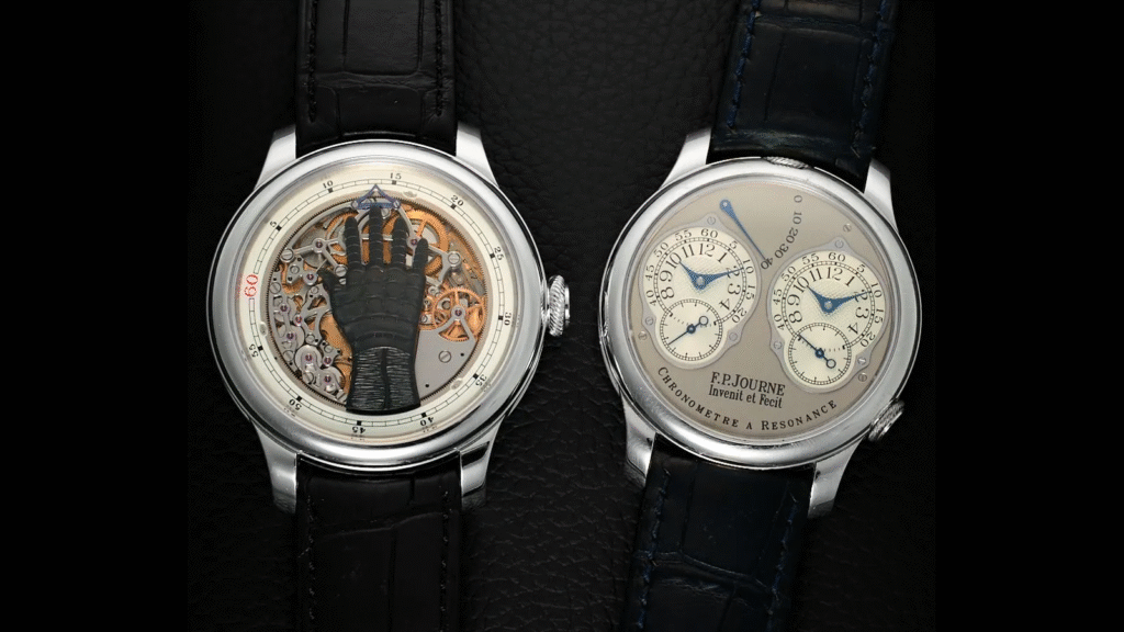 A sinistra il F.P. Journe Chronomètre à Résonance, inizialmente sviluppato come orologio da tasca nel 1983, e poi adattato da Journe alla struttura di un orologio da polso nel 2000. A destra il Breguet Classique ref. 5140.