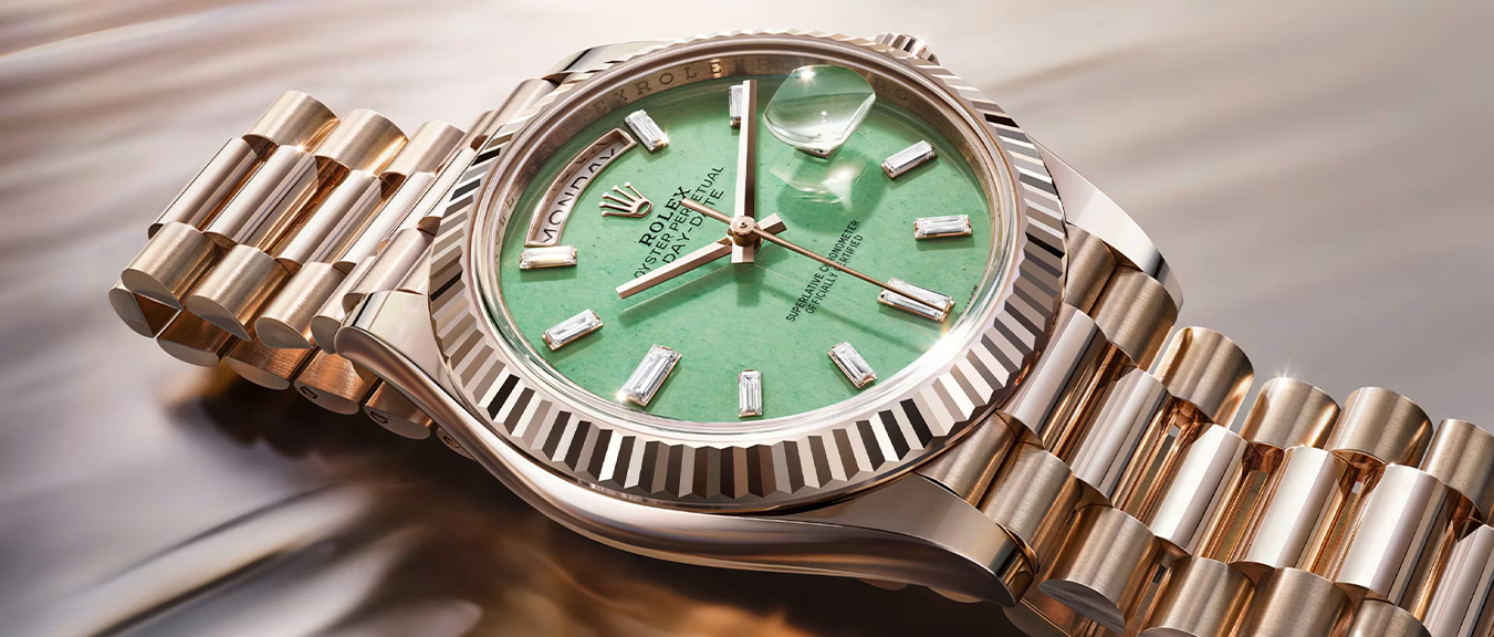 Il Day-Date 40 si muove su un registro leggermente diverso, dove elementi decorativi come il motivo gold leaf o l’avventurina verde con indici in diamanti taglio baguette si inseriscono in una struttura più tradizionale, senza rinunciare alla ricchezza visiva. Qui emerge con chiarezza la capacità di Rolex di innovare restando fedele ai propri codici.