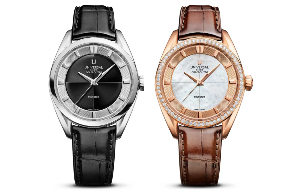 Nella linea principale Prêt-à-Porter, Universal Genève propone cinque modelli che reinterpretano con rigore contemporaneo i codici estetici del Polerouter. Il caratteristico motivo a “mirino” si inserisce su un quadrante a cupola con doppia finitura, generando una raffinata complessità visiva. L’anello esterno acquisisce profondità grazie all’alternanza di superfici lucide e opache, mentre le anse ritorte vengono ridisegnate con maggiore essenzialità per una vestibilità più attuale.