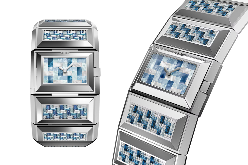 Le casse in oro bianco sono decorate con un motivo a spina di pesce realizzato in diamanti baguette e zaffiri declinati in diverse tonalità, evocando intrecci tessili. Il quadrante nascosto, accessibile tramite il caratteristico meccanismo a cerniera, riprende questo motivo attraverso un mosaico in madreperla, esaltando una sofisticazione discreta e altamente artigianale.