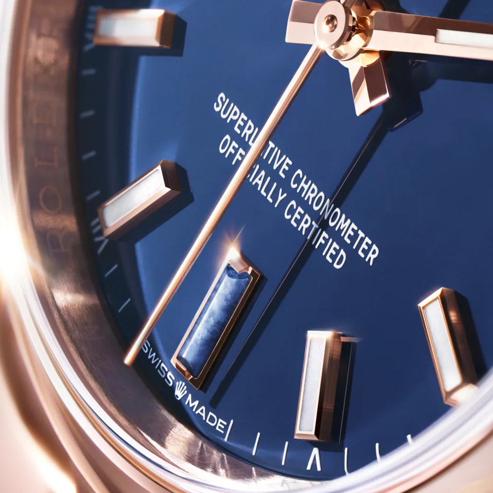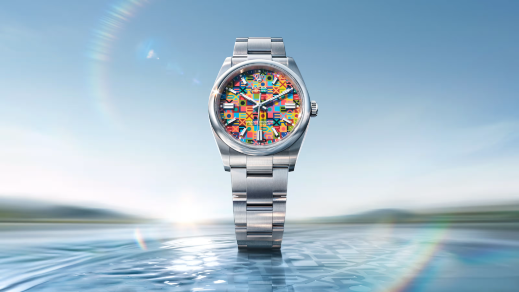 The dial of the Oyster Perpetual 36 offers a refined and extremely modern reinterpretation of this motif that was introduced in the late 1970s and has become iconic, and it stages the letters of the name “Rolex” in a play of contrasts that associates a total of ten shades.