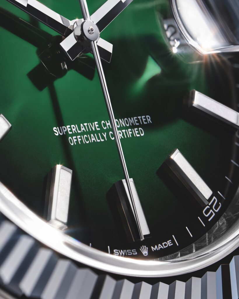 On the slate dial, a shade unheard of in the Oyster Perpetual range, the words “100 years” stand out at 6 o’clock, where “Swiss Made” is generally found. In addition, each five-minute interval on the minute track is marked with a green square and the name “Rolex” pad-printed in the same green, the color identity of the Brand.