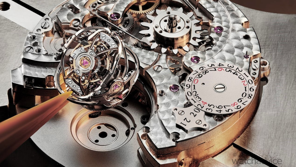 The watch is a hybrid of modernity and the past, which has greatly affected this timepiece. It features a perpetual calendar, which means that in addition to the time, it shows the alternation of day and night, the phases of the moon, the day, the month and the current year, with a special feature; in fact, thanks to a patent filed by the brand, if the current year was a leap year, it would be understood by the red coloring of the last number in the date window. In addition to this, as soon as you look at the watch you cannot help but notice the flying tourbillon at nine o’clock, which steals the show from a majestic handcrafted dial with a mix of finishes.