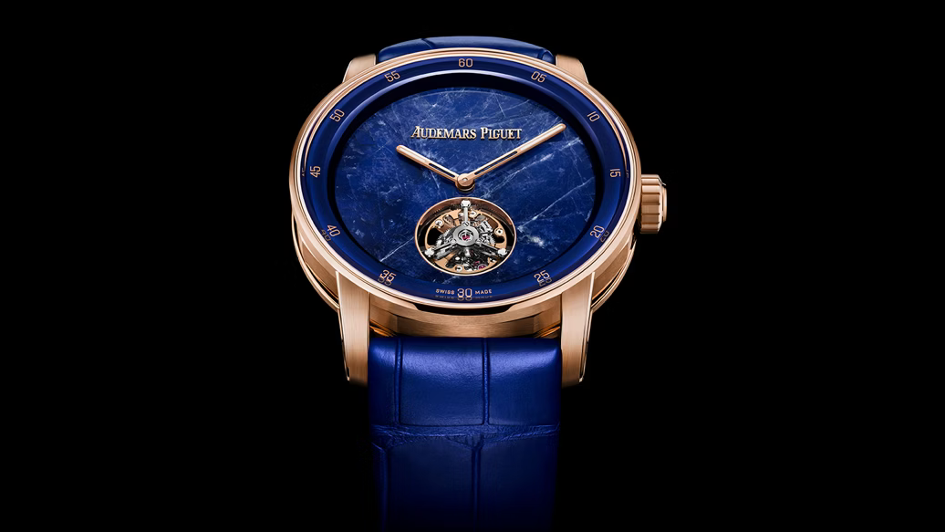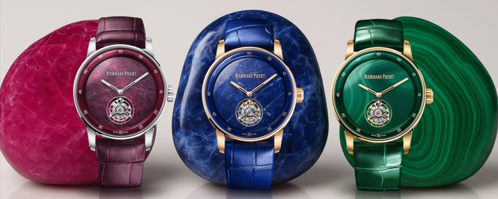 This year, the Maison in the Vallée de Joux, a place where time seems to dilate among the mountains and silence is interrupted only by the metallic beating of thousands of balance wheels, Audemars Piguet celebrates its 150th anniversary with a creation that is a hymn to matter and watchmaking. The Code 11.59 by Audemars Piguet collection is enriched with three new limited-edition references, each with a dial made of an extraordinarily beautiful natural stone: ruby, blue sodalite and green malachite. Three interpretations of one and the same spirit: that of a manufacture that has been turning technique into emotion for a century and a half.