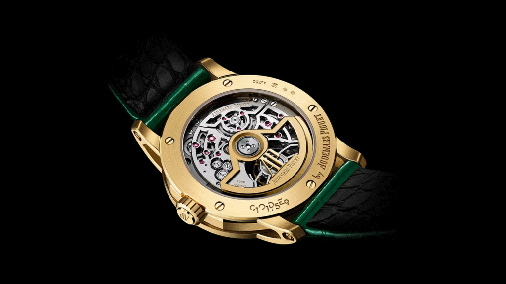 The straps, in large-scaled alligator leather, complete the harmony of the ensemble. But Audemars Piguet is also thinking about contemporary life: a matching, interchangeable rubber strap is available upon request, for versatility that allows the watch to move naturally from elegant to everyday settings, without ever sacrificing sophistication.