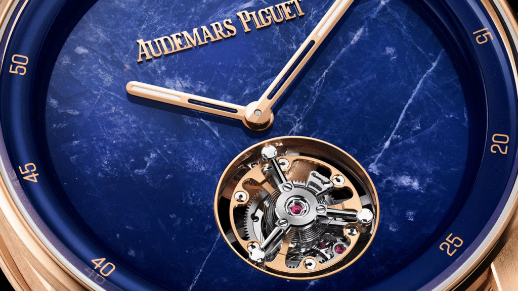 The technical challenge is enormous: reducing the size of such a noble complication without sacrificing its balance or precision. Yet thanks to a titanium cage with a peripheral drive system and a high-amplitude escapement, Audemars Piguet has managed to maintain excellent performance, guaranteeing 50 hours of power reserve and a mechanical beauty that can be perceived even if only by watching the tourbillon float at six o’clock, as if suspended above the living stone of the dial.