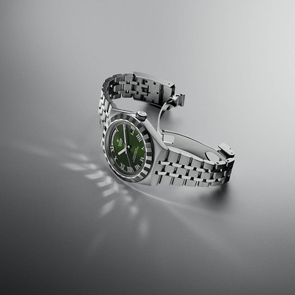 Come nei modelli Royal precedenti, il bracciale integrato resta un elemento centrale del design. La costruzione a cinque maglie presenta superfici esterne e centrali satinate abbinate a maglie intermedie lucide, creando un contrasto elegante che si integra perfettamente con le finiture della cassa. Uno degli aggiornamenti più pratici è l’introduzione della chiusura “T-fit” di Tudor, che consente micro-regolazioni rapide senza l’uso di strumenti.