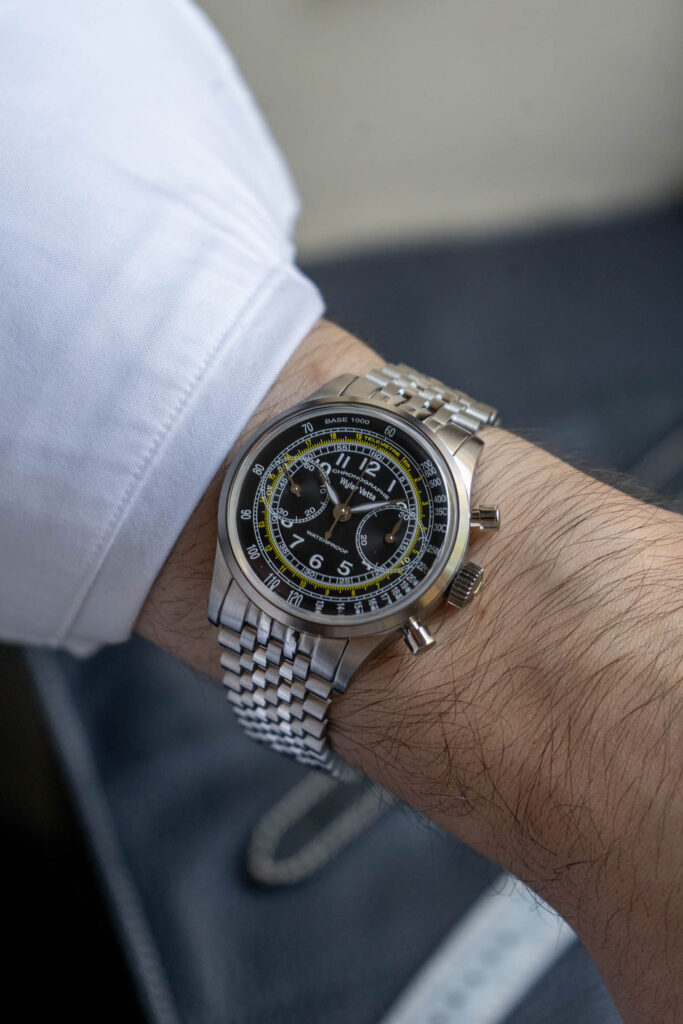 What sets the new Wyler Vetta Chronographe apart is the exquisitely vintage styling. The dials have a bicompax layout with internally a base 1000 tachymeter scale (which allows calculation of the average speed of a moving object over a predefined distance) and a 1-km telemeter scale (functional instead for measuring the approximate distance to an event that produces both light and sound) flanked by Arabic numerals and the historic inscriptions “waterproof,” “chronographe.”