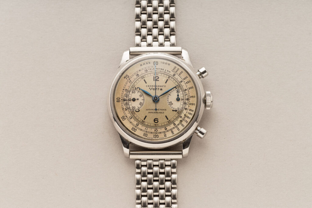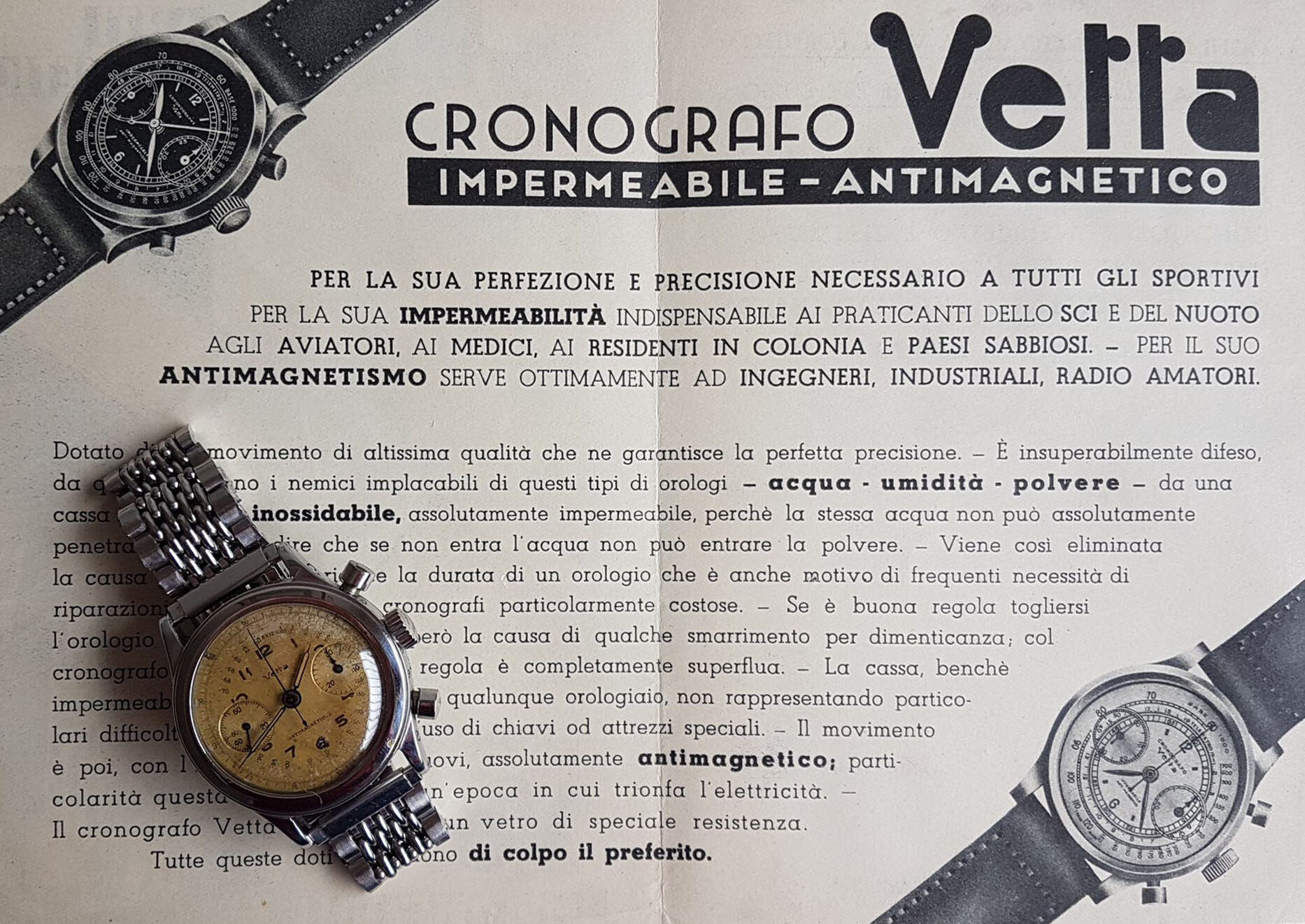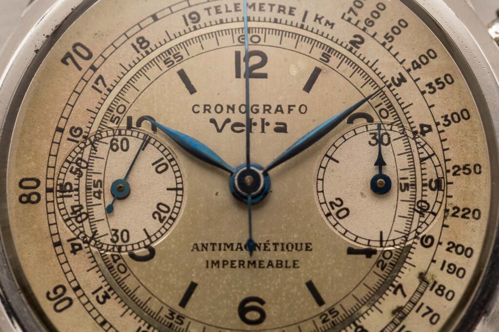 The range of years between the 1930s and 1960s represents the golden age and counts the production of fine watches, especially in the “chronograph” category. Extraordinary Iterations such as the Vetta Chronometre, Chronographe Antimagnetique, Chronographe Antimagnetique Impermeable and Chronograph Hermetic, all equipped with the iconic Valjoux 14, 22 and 72 calibres.