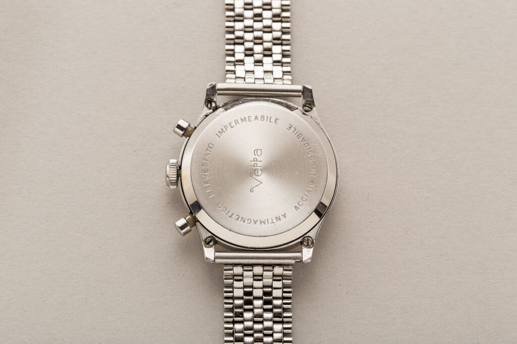 The Ermetico possessed precise characteristics that earned it the title of the first waterproof chronograph in watchmaking history. A two-body case with no bezel, pump pushers, glass mounted directly on the carrure, a snap-in case back, and the unfailing Valjoux 22.
