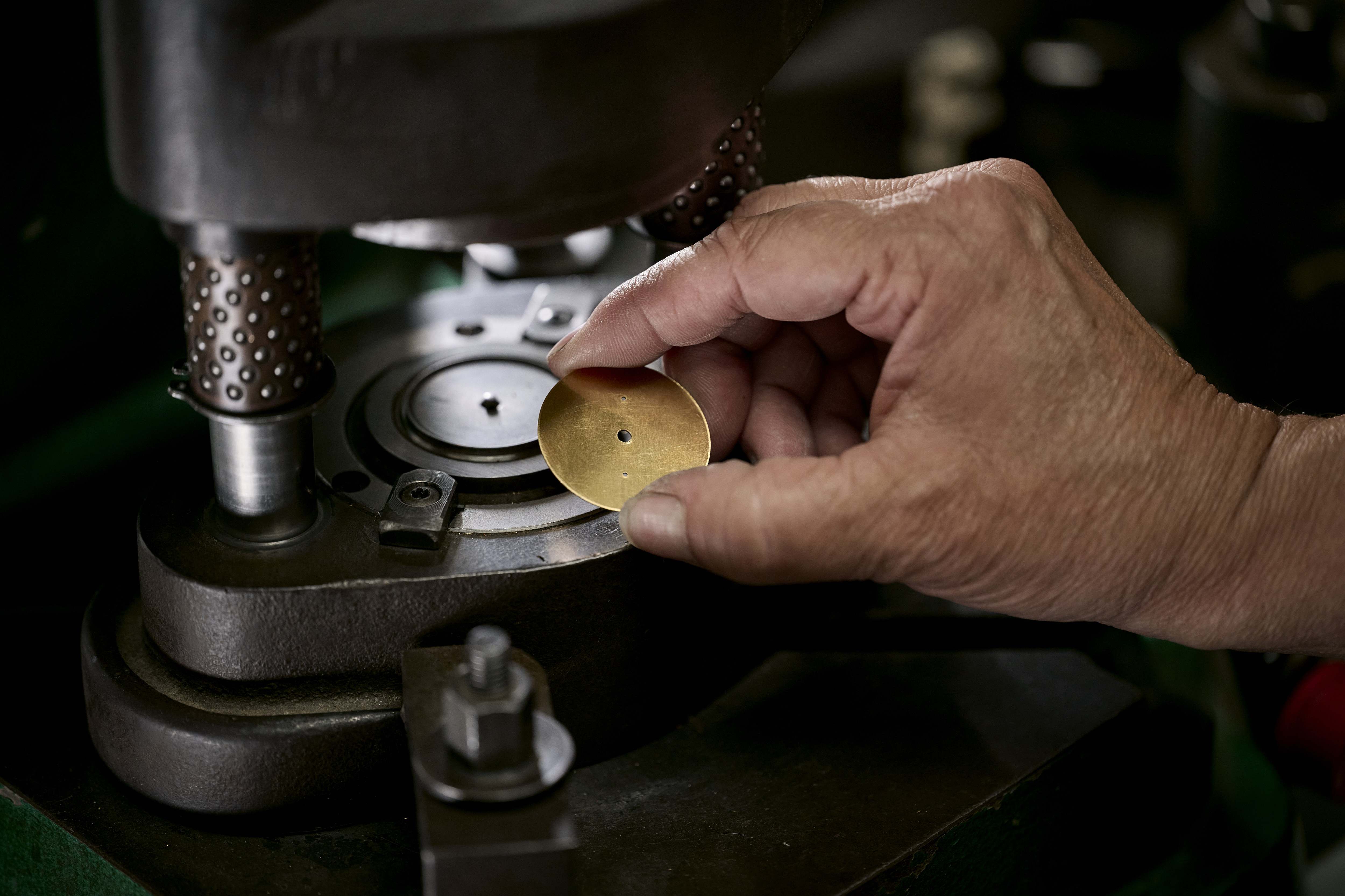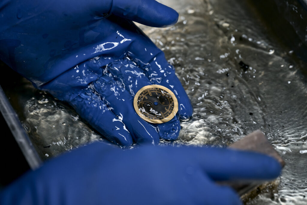 It takes shape through careful and refined workmanship, requiring days of meticulous finishing to achieve impeccable color rendition. The result is a deep, velvety black, a faithful evocation of 1950s models, an emblem of elegance and prestige. The central element is galvanic finishing: a delicate phase in which the dial is immersed in an electrolytic bath through which current flows. Through a controlled sequence of immersions, precisely calibrated according to electrical intensity, temperature and humidity, the shade we see is achieved.