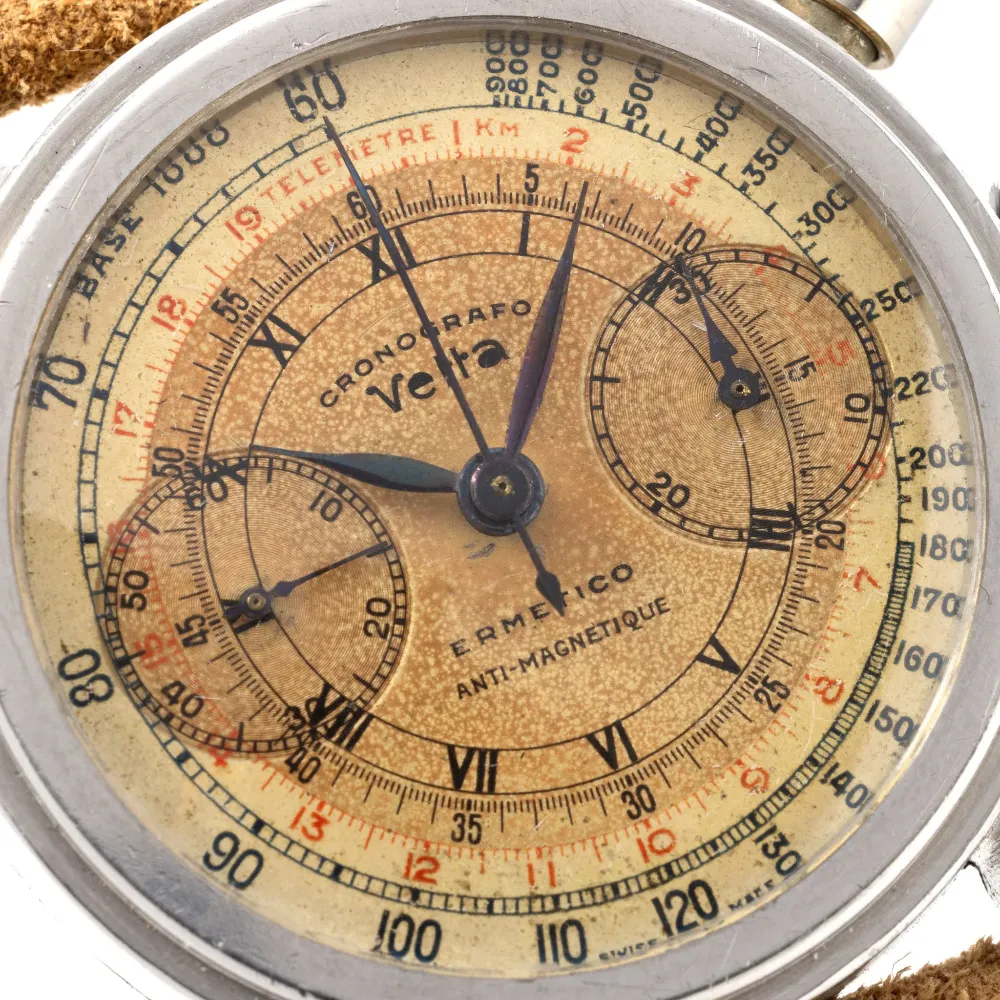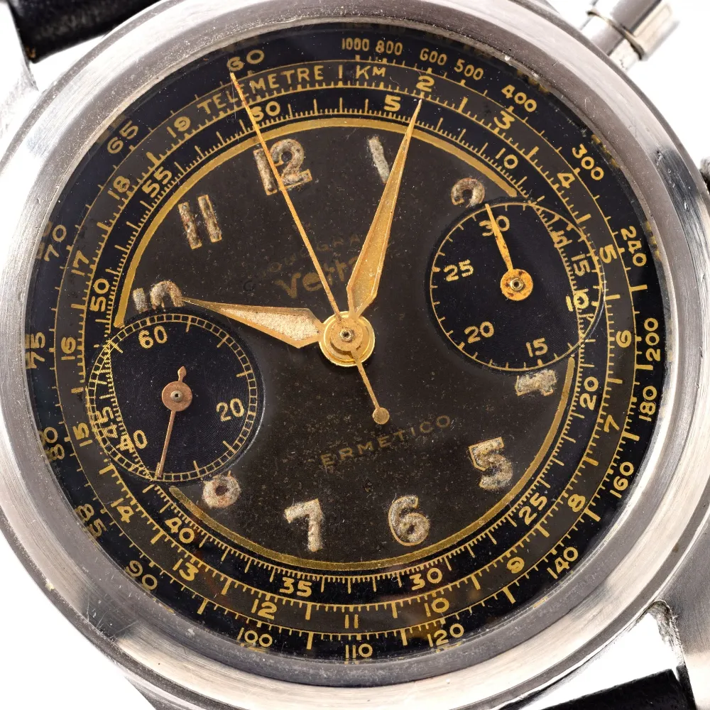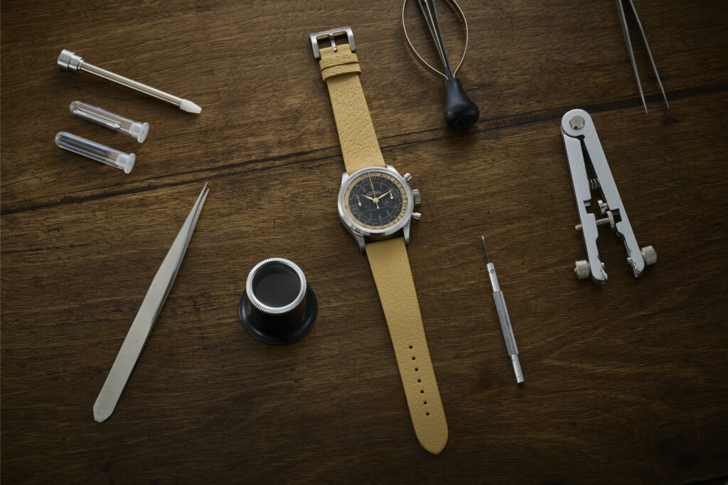 If the Wyler Vetta “Tribute to Ermetico” was the highest callback to the 1940s, perhaps this new version is even more so. With the launch of the Chronographe 38 GILT, the Maison has revived the historic gilt dial finish, one of the most fascinating of the 1940s.