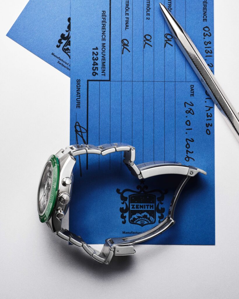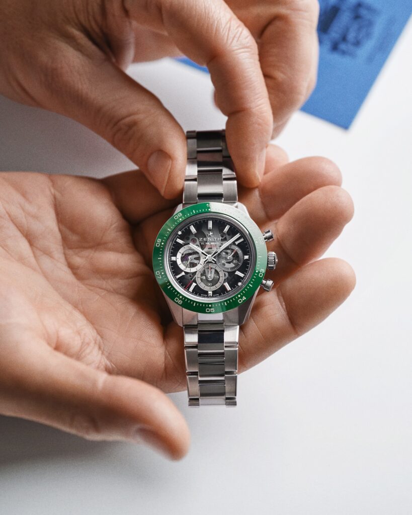 C’è poi un aspetto strategico rilevante. Ogni Chronomaster Sport Skeleton in acciaio viene fornito con bracciale a tre maglie dotato di ZENCLASP e con un cinturino in gomma aggiuntivo, nero per la versione con lunetta nera e verde per quella con lunetta verde. Zenith prevede inoltre l’introduzione progressiva della nuova chiusura su altri modelli e referenze. Ancora più importante, ZENCLASP è compatibile con i bracciali Chronomaster Sport già esistenti che ne erano sprovvisti.